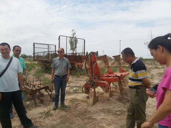 2015年7月9日上午,兵团农机推广技术总站麻站长一行在六师(市)农机技术推广站宋明理等陪同下,来到了六师103团12连农机大户闻新明的家里进行调研,此次调研主要目的是为农机新技术---子午线超低压轮胎节能降耗项目的试验进行摸底。师市计划在103团组织一次大规模子午线超低压轮胎节能降耗的现场演示会,为成功举办演示会,六师及团场推广站对动力机械拖拉机、牵引犁及实验地块进行了认真的调查研究与落实。