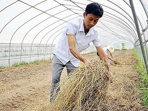 湖北省鄂州市太和镇金土地农机专业合作社利用秸秆生物反应堆技术,将秸秆通过生物反应重新转化为二氧化碳、水、热量等,促进资源循环增值利用和农作物高产、优质、无公害生产,播种的辣椒等大棚蔬菜作物有望亩增产量30%至40%。图为近日,该合作社社员在大棚内铺盖秸秆生物反应堆。